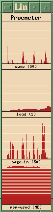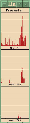 Procmeter has resemblances to several other process meters available, but the author, Andrew M. Bishop, has distinguished his program by reducing the overhead needed and making a choice of views quick and menu-driven. If the Procmeter title just beneath the title bar is clicked, a menu with twenty-five different entries drops down. Choices include network activity, paging, disk activity, and cpu activity, with each being represented by several variants.The program starts with whatever default views you like, but while it's running you can view and dismiss any of the others. As an example, there is little point in monitoring packet transfer when you're not online!