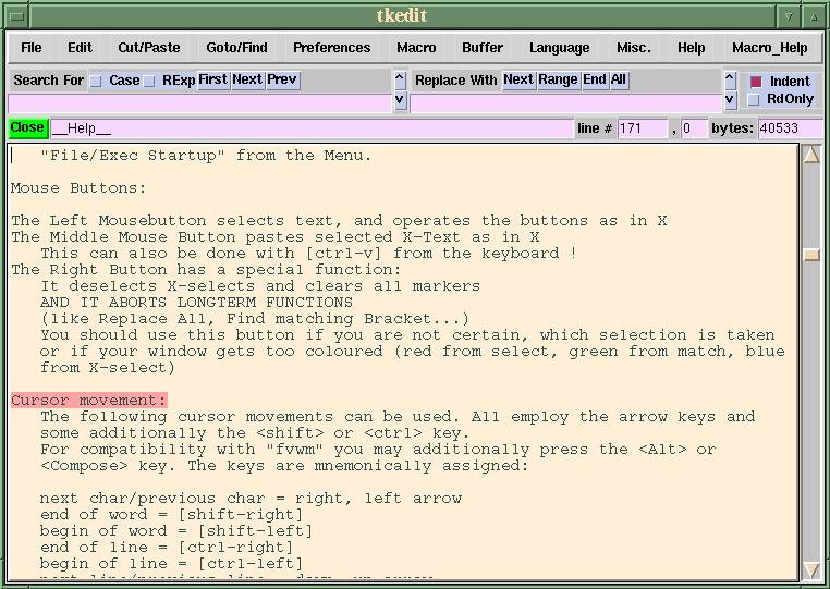Being programmed in Tcl gives the editor the advantage of having a very powerful macro language built right into the guts of the program. An interesting aspect of this application is the variation on the usual tendency to have a single .*rc startup file in the home directory; TkEdit instead has a ~/.Tkedit_macros subdirectory in which the user places whichever of the preconfigured macros suit his or her editing style. New macros can be placed there as well. An extensive collection of these is installed in a subdirectory off of the /bin directory TkEdit lives in; they can be loaded while the program is running as well as from the start-up directory.
