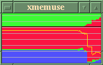 This is an Xmemuse window running in a well-loaded Linux session, with Netscape, Emacs, and several other applications running in different virtual desktops. The free swap space is at the top; you can see this begin to diminish as the programs are started.