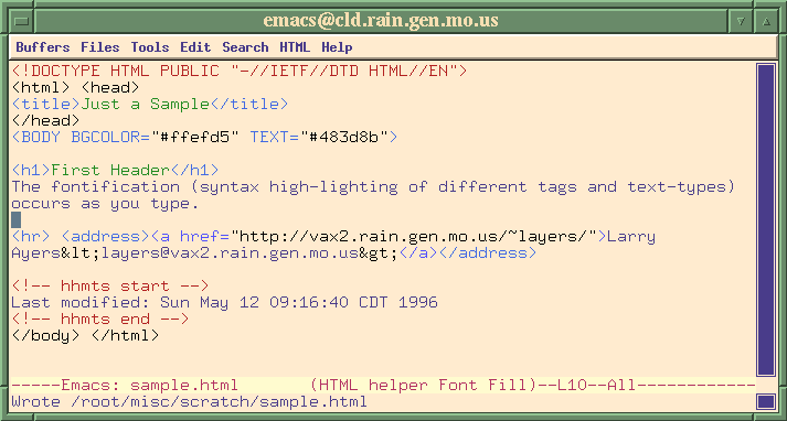 When a new *.html file is created a basic template is inserted in the file, complete with an automatic timestamp at the end. Here is a screenshot showing the default layout with font-lock enabled: