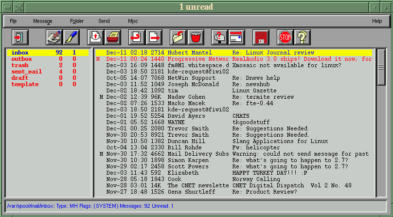 Many of the X-windows mailers I've tried have either been too basic, too beta, or awkward to use. I've always returned to Pine, my standby. Recently two X-based mailers have been released (in late beta versions), both of which are stable and well-provided with features and options. When I say stable I mean that they have functioned well for me, I haven't lost any mail, and they both have been through several releases in which the most egregious bugs seem to have been ironed out.