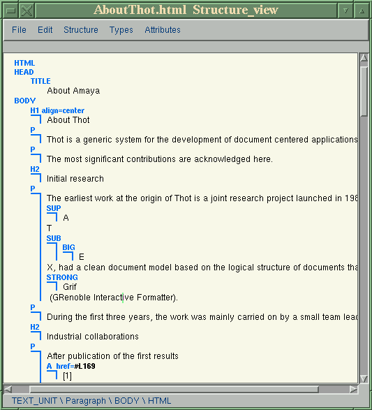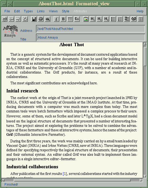 For several years a group of programmers in France have been developing an elaborate text-processing system known as Thot. Thot has some resemblances to Tex, in that it is a structural document-editing system capable of very high-quality output. One major difference is that Thot is more WYSIWYG; the formatting tagging is hidden and doesn't have to be explicitly written by the user. The output formats are more varied as well. Thot can produce Postscript files, as Tex can, but it can also produce plain ASCII text and HTML. This last formatting capability attracted the attention of the W3 Consortium a couple of years ago. (W3 is an international research organization which attempts to set standards for Internet documents; their flexibility and patience have been sorely tried in recent years by the flood of HTML innovations introduced by Microsoft and Netscape, among others). Using the Thot system as a core, the W3 group in collaboration with the Thot developers have been developing a combined web-browser and HTML editor known as Amaya.