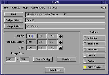 Font3D and XFont3DOne of the problems with using 3D graphics for logos is the lack of good model data for the fonts. A quick scan of the various model banks, such as Viewpoint Datalabs Avalon archives or 3DSite, finds very few canned models of fonts. Besides, do you really want to hang on to a complete set of letters in a given font as model data? After all, how often will you be using X, Q or Z? (Of course, cyberworld artists probably use these all the time, but that's another story).Fortunately, this problem is easily solved using Todd Prater's Font3D utiltity. Font3D is a tool for converting text strings using a given font into model data which can be read by a variety of modelling programs and rendering utilities. Output formats include support for POV-Ray (both 2.x and 3.x formats), Raidance, Vivid, AutoCad DXF, Renderman RIB, and RAW Triangles. The model data can be generated using a healthy set of Font3D command options. Features such as face textures, beveling of both front and back faces, length of face and side cuts for beveling, and object positioning are provided. Font3D supports both Macintosh and MSWindows TrueType font files. Font3D is, I believe, shareware. The register.txt file states it runs for $10US, although it doesn't state explicitly that you need to register. Since the files in the latest version, 1.60, are dated with a January 1996 date, I suspect that either no new work has been done on Font3D in some time or only registered users are getting updates. Then again, once you've seen the breadth of command options avialable, you might wonder what new features could be added. You can fetch the C++ source for Font3D from its primary archives at http://www-personal.ksu.edu/~squid/ font3d.html. You can also fetch a slightly older version from the POV-Ray archives at ftp://ftp.povray.org/pub/poray/utilities. This latter version is th 1.51 version. I'm not certain why, after all this time, the 1.60 version has not been added to the POV-Ray archives. Also note that the 1.51 release includes a large DOS and OS/2 binaries in the zip file, along with the C++ source. The 1.60 release broke out the DOS and OS/2 binaries and includes only the source. The source for 1.60 comes in a zip file. If, like me, you are unfamiliar with C++, don't worry. The Makefile provided builds the source without modification. There really isn't all that much to the source, which makes dealing with the build all that much simpler. The Makefile assumes you have GCC/G++ installed and in your path. For Linux users this is pretty much a given, especially if you've installed from one of the well known Linux distributions (Red Hat, Debian, SuSE, Slackware, etc.). Basically, just follow the installation instructions for Unix systems that can be found in the font3d.txt file, or if you prefer, in the font3d.ps document. The code appears quite stable, producing usable code for both POV and RIB (via BMRT) as well as DXF and RAW files that were parsable by the latest version of the AC3D modeller. Font3D processes a specified string using a specified font