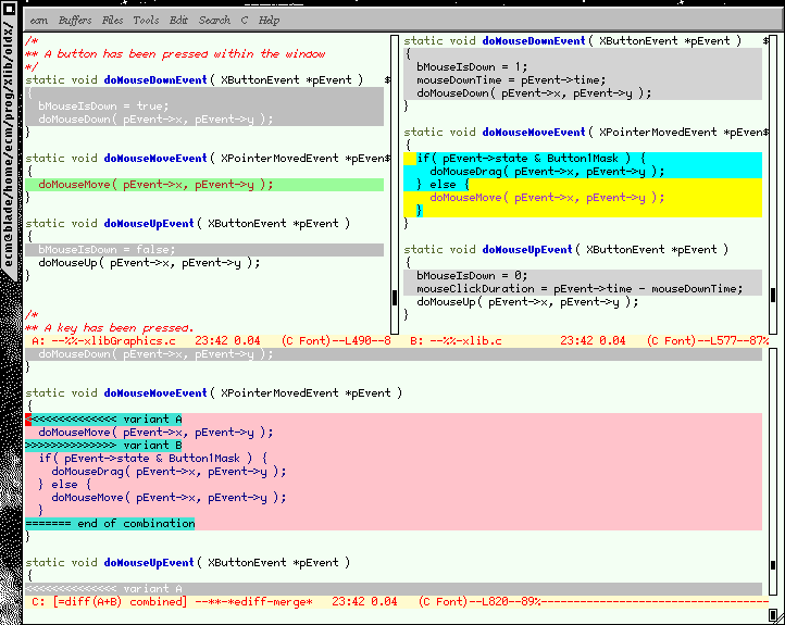 (for the curious, the window manager is a slighly modified version of Chris Cannam's almost-minimal wmx). Differing lines --or hunks in diff parlance-- in the two files are highlighted in grey, and you can step through them by typing n (next) or p (previous) into the control window. The active hunk is highlighted in color, with the exact words which differ displayed in a separate color (this process is called refining, and is done by Emacs itself, not by diff). Naturally Ediff works best when run under a windowing system, but it does work in degraded mode in the console.