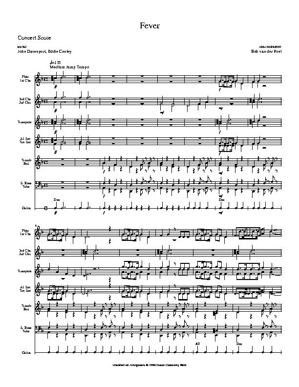 Flushed with the success of doing these simple charts, I decided to try a more complex task. I also play in a fifteen piece dance band. Most of the music we play is arranged by our leader, but recently some of the members have doing them as well. So, I decided to give it a try. My first arrangement of the old standard Fever took the better part of two days to complete. It is arranged for 11 voices on 6 staves. We played it the other night and I was pleased--not only was everyone impressed by the appearance of the charts, it didn't sound to bad either. I have printed out the first page of the conductor's score .