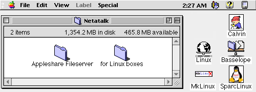On the Macintosh side, Netatalk provides the connectivity services. Netatalk is a Unix implementation of the AppleTalk Protocol Suite, originally for BSD-derived systems. It includes support for routing AppleTalk, serving Unix and AFS file systems over AFP (AppleShare), serving Unix printers and accessing AppleTalk printers over PAP. A number of other minor printing and debugging utilities are also included. |