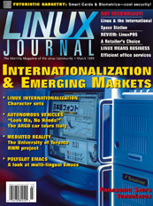 The March issue of Linux Journal will be hitting the newsstands February 11. This issue focuses on Internationalization and Emerging Markets with articles on multilinual Emacs, printing messages in different languages, autonomous automobiles in Italy and mediated reality. This last is the second part of Dr. Steve Mann's series on wearable computers. Linux Journal now has articles that appear "Strictly On-Line". Check out the Table of Contents at http://www.linuxjournal.com/issue59/index.html for articles in this issue as well as links to the on-line articles. To subscribe to Linux Journal, go to http://www.linuxjournal.com/ljsubsorder.html.