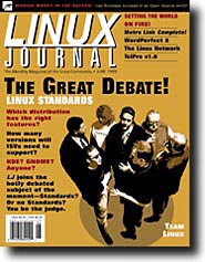 The June issue of Linux Journal will be hitting the newsstands May 14. This issue focuses on Standards with an article by Daniel Quinlan about what's happening with the Linux Standard Base Project and one in which the various distributions tell us how they feel about standards. Linux Journal now has articles that appear "Strictly On-Line". Check out the Table of Contents at http://www.linuxjournal.com/issue62/index.html for articles in this issue as well as links to the on-line articles. To subscribe to Linux Journal, go to http://www.linuxjournal.com/ljsubsorder.html.