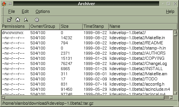To extract the files from the archive, right-click on the file name in KFM and click on Archiver. You will get a window very similar to the one above for KDevelop. From the Archiver's Edit menu, select Extract; click on All Files and select a directory to extract the files to. In most cases, the tarballs will extract by default to a new subdirectory of the directory name you specify. For KDevelop, we can see that the first entry in the tarball is: