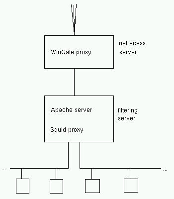 A simple setup would then be to program the clients to use the net access server as their web proxy, and use the filtering server as a firewall. This is just about the most classical distribution of roles imaginable.