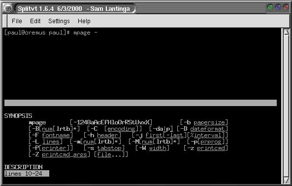 Splitvt gives you two consoles in one by splitting the console horizontally. If you click on the thumbnail to the right you'll immediately see how handy it is for viewing man pages while you're building a command line. 'Control-W' is used to bounce back and forth between windows.
