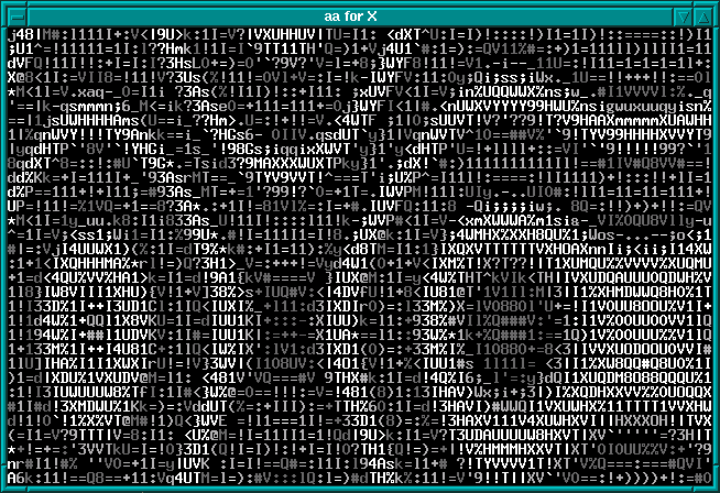 bb is a fully-working ASCII demo, which uses ANSI C and is SVGA compatible. bb makes use of the aa_lib package (ASCII art library) so you will have to install it along with the main package. The demo produces a range of different simulated pictures, from random tumbling characters (going through different shades of grey), to an ASCII simulated mandlebrot fractual!! (which incidentially inspired the colour version of Xaos).