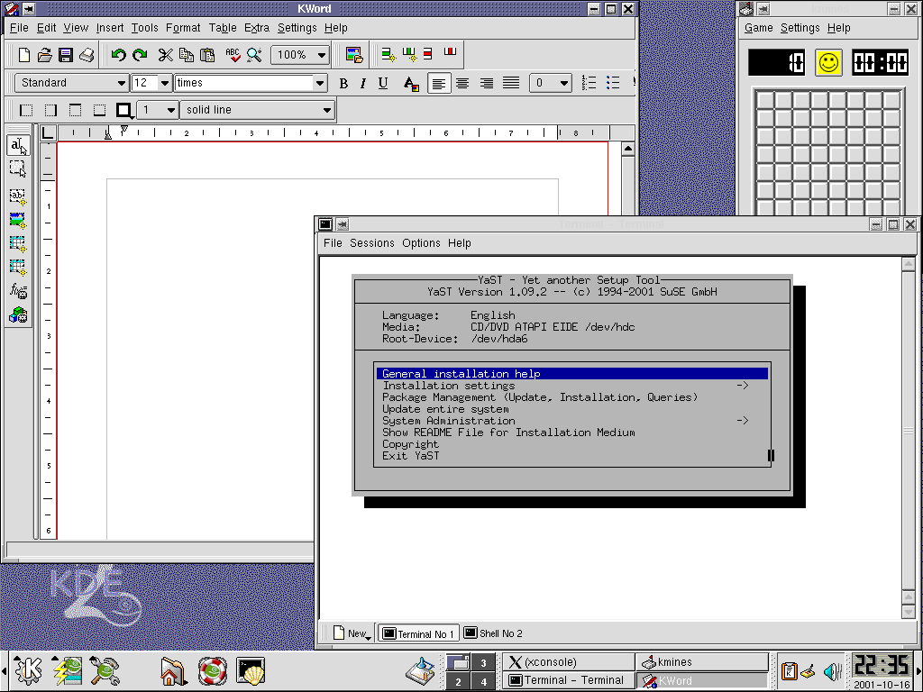 For the Solaris install I created a root partition of 5GB with a 512 MB Solaris swap partition and a 2GB /export/home partition. Now I started the Linux install. I installed the first SuSE CD and rebooted the computer. When the boot started I did the Stop-A thing and typed "boot cdrom". I let YaST2 run and selected manual partition editing. I created a 512MB Linux swap partition, a 16 MB /boot partition, and the rest of the drive as the Linux / partition.