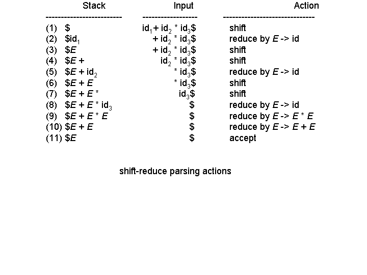 A convenient way to implement a shift-reduce parser is to use a stack and an input buffer. Let `$' symbol mark the bottom of the stack and the right end of the input.