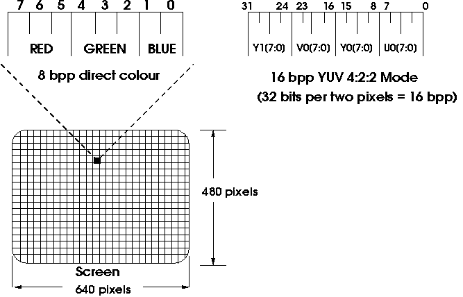 2. Each dot displayed on the screen is represented by a corresponding byte (8 bits) within the frame buffer. Hence the acronym 8 bpp, which stands for 8 Bits Per Pixel.