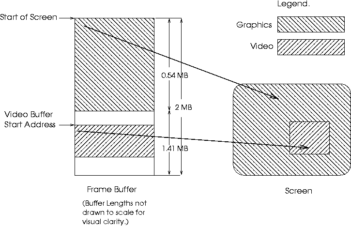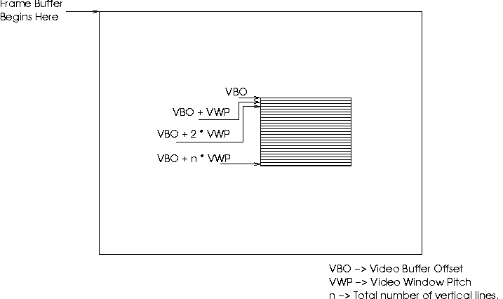 Any data within the frame buffer, is immediately reflected on the screen. This is the job of the VGA controller. If you want to display something on the screen, all you need to do is to dump some data into the frame buffer. Voila! You can immediately see it on screen. On most platforms, this will involve just a plain memory to memory copy, because the frame buffer is mapped into the physical memory address space, just like any other RAM. However on a system which implements some sort of memory protection, applications may not be allowed direct access to system RAM. In Linux, this is controlled by means of the mmap() system call in conjunction with the /dev/ram device node or the frame buffer device driver. Check the manual page of mmap() for details. Of course, for this to work sensibly, the VGA controller has to agree with you about what you wanted to display, and what you wrote into the frame buffer, and where. This is done by "setting the VGA mode". By setting the VGA "mode", the meaning of every bit of data in the frame ram, is now known to the VGA controller. For example, if the VGA mode is set to "640x480" at 8 bpp. The VGA controller knows two things about the display: