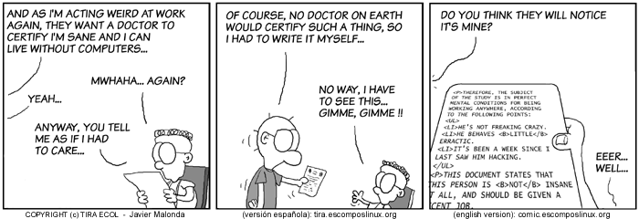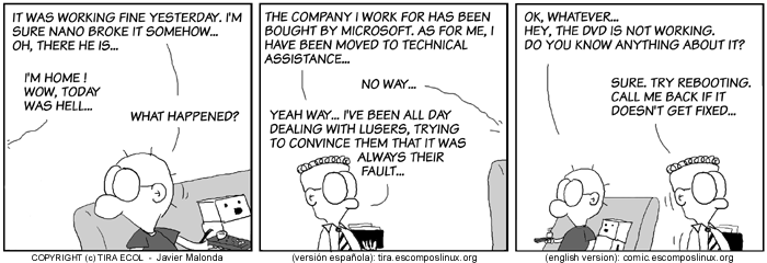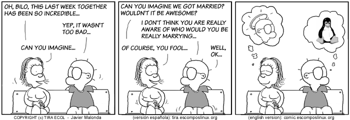 The Ecol comic strip is written for escomposlinux.org (ECOL), the web site tha t supports, es.comp.os.linux, the Spanish USENET newsgroup for Linux. The strips are drawn in Spanish and then translated to English by the author.