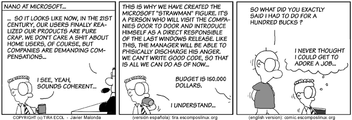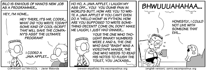 All Ecol cartoons are at tira.escomposlinux.org (Spanish), comic.escomposlinux.org (English) and http://tira.puntbarra.com/ (Catalan). The Catalan version is translated by the people who run the site; only a few episodes are currently available.