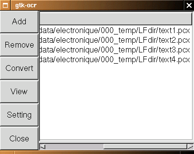 Şimdi gtk-ocr zamanı, gocr ön ucu. gocr bir optik karakter tanıma yazılımıdır. Kullanması çok kolay: Sadece dosyaları seçmem gerekir ve gtk-ocr her şeyi yönetir. Bana her işlenmiş .pcx dosyası için bir .txt dosyası verdi.